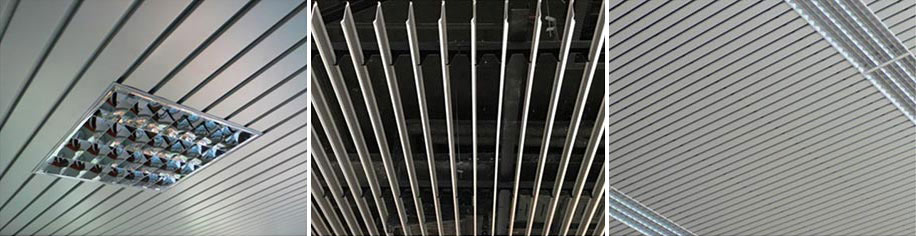 Von links nach rechts: Abgehängte Aluminium-Paneeldecken, Aluminium-Lamellendecken, ballwurfsichere Stahl-Sportpaneeldecken